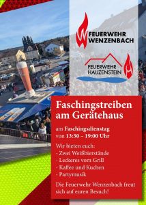 Die Feuerwehr lädt wieder ein zum Faschingstreiben am Feuerwehrgerätehaus!