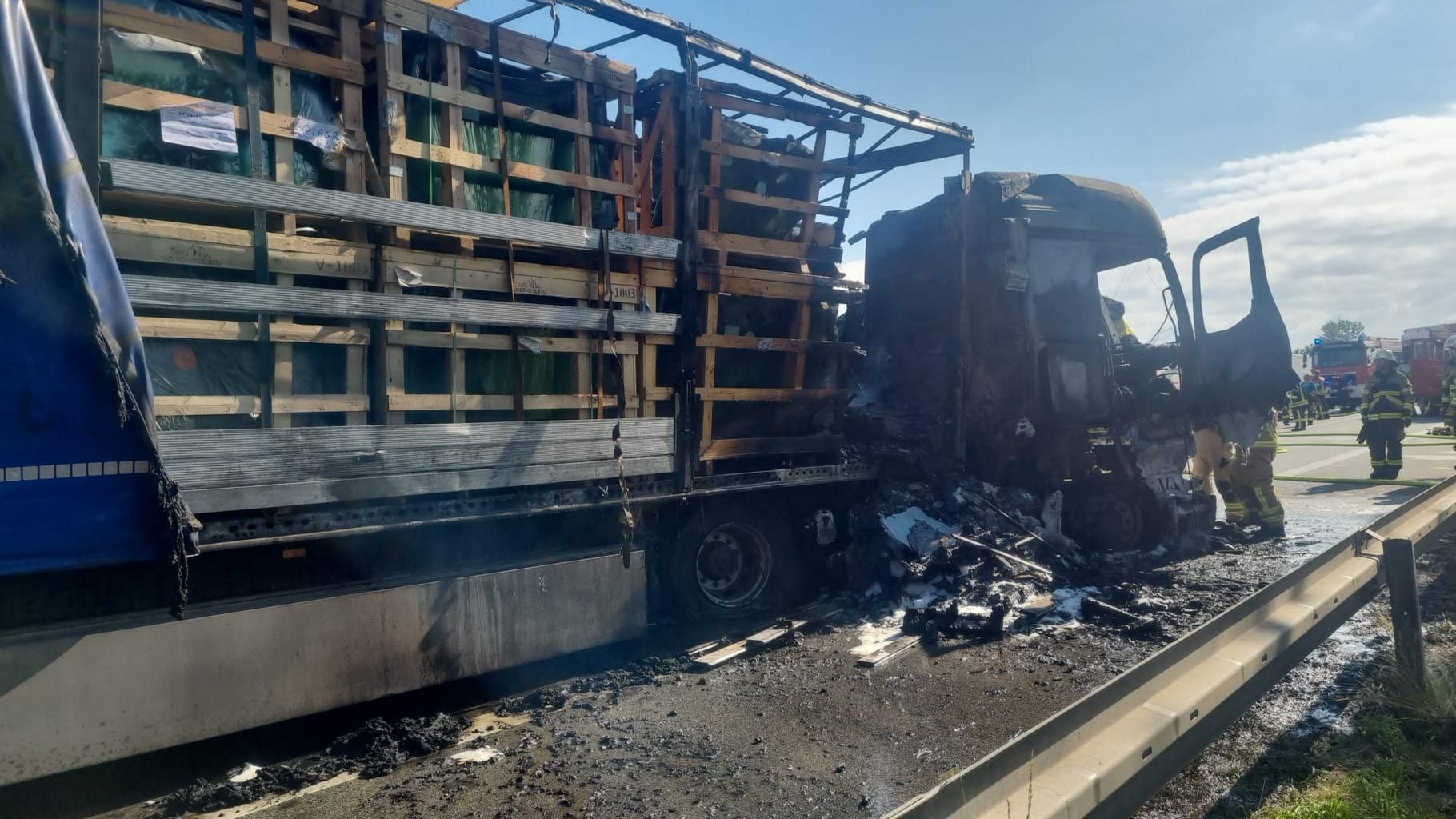 Dort standen zwei LKW nach einem Unfall im Bereich der Zugmaschinen in Vollbrand.