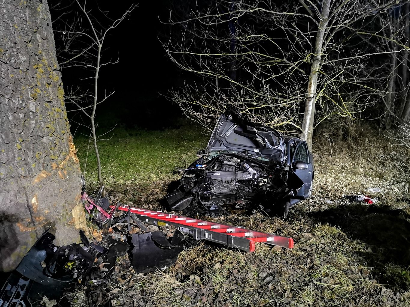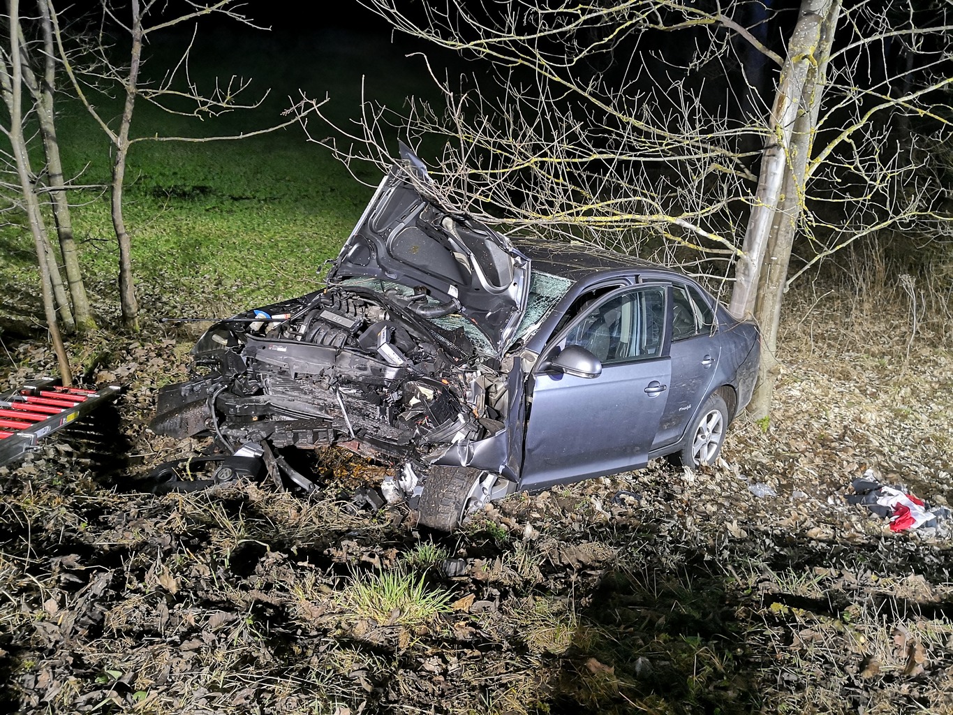 Ein PKW ist alleinbeteiligt von der Straße abgekommen, frontal gegen einen Baum geprallt und in der Böschung zum Liegen gekommen. Nach unserem Eintreffen bestätigte sich die Lage "eingeklemmt" glücklicherweise nicht, auch war der "Helfer vor Ort" bereits vor Ort und betreute zusammen mit dem Ersthelfer, der den Unfall meldete, den schwerverletzten Patienten.