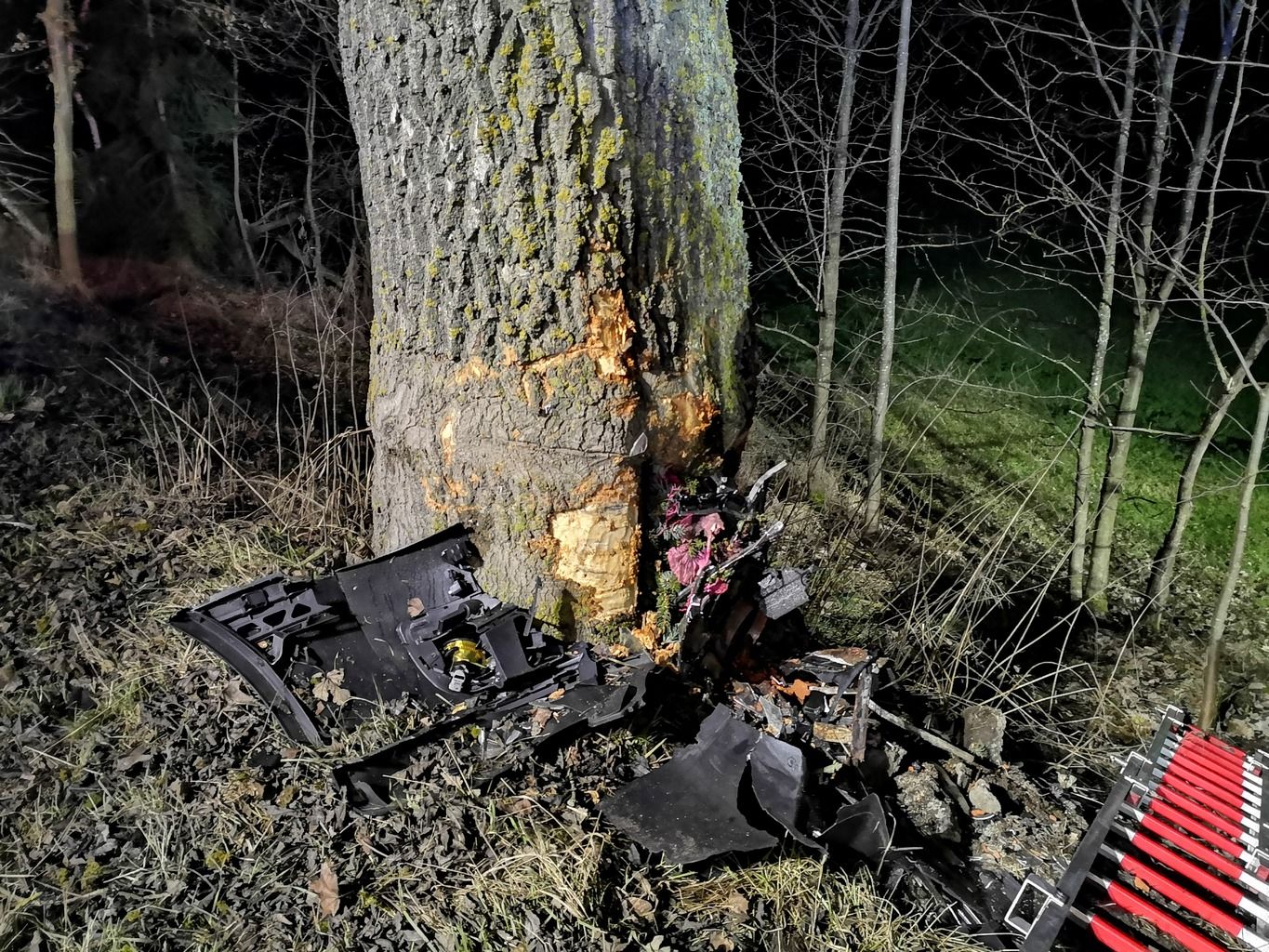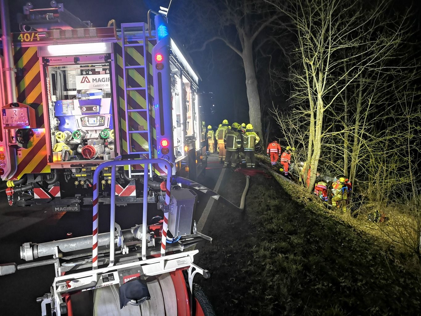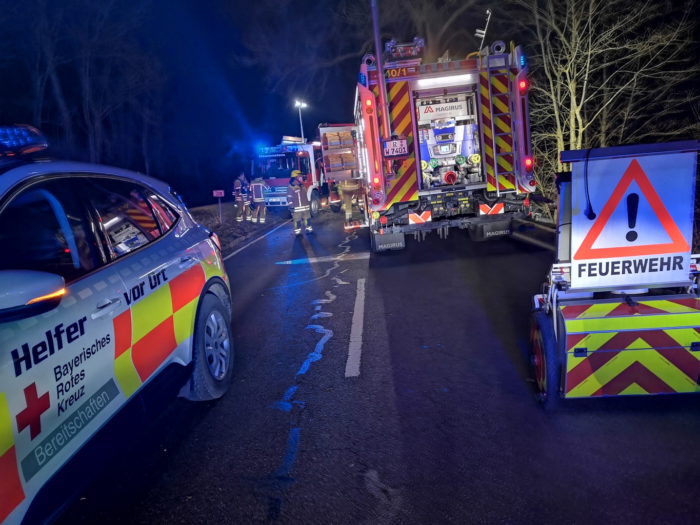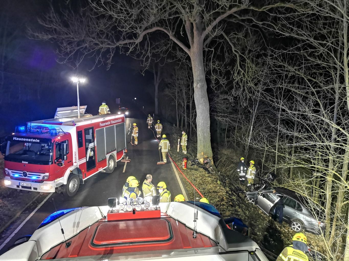 Die Feuerwehr Wenzenbach brachte zunächst den Brandschutz in Stellung, da es im Bereich des Motorraumes bereits zu schmoren begann. Einer unserer Sanitäter unterstützte den Rettungsdienst bei der weiteren Versorgung des Patienten. Zeitgleich wurde die Unfallstelle großflächig ausgeleuchtet sowie Steckleiterteile an der Böschung ausgelegt, um die Zugänglichkeit zum PKW zu verbessern. Die Hauzensteiner Kameraden öffneten den Motorraum mit dem Rettungsspreizer um die Schmorstellen mit Kleinlöschgerät abzulöschen.