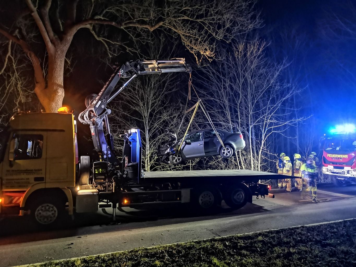 Nachdem der PKW vom Abschleppdienst mittels Kran aus der Böschung gehoben und abtransportiert wurde, reinigten wir die Straße und hoben anschließend die Vollsperrung wieder auf.