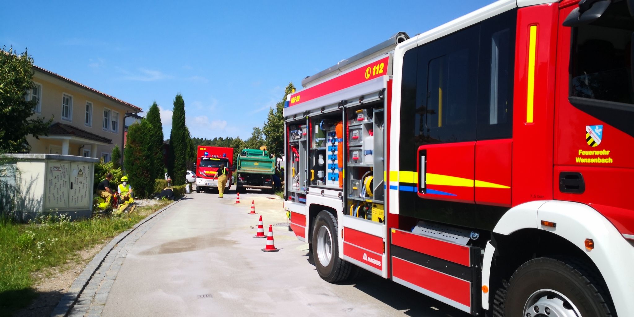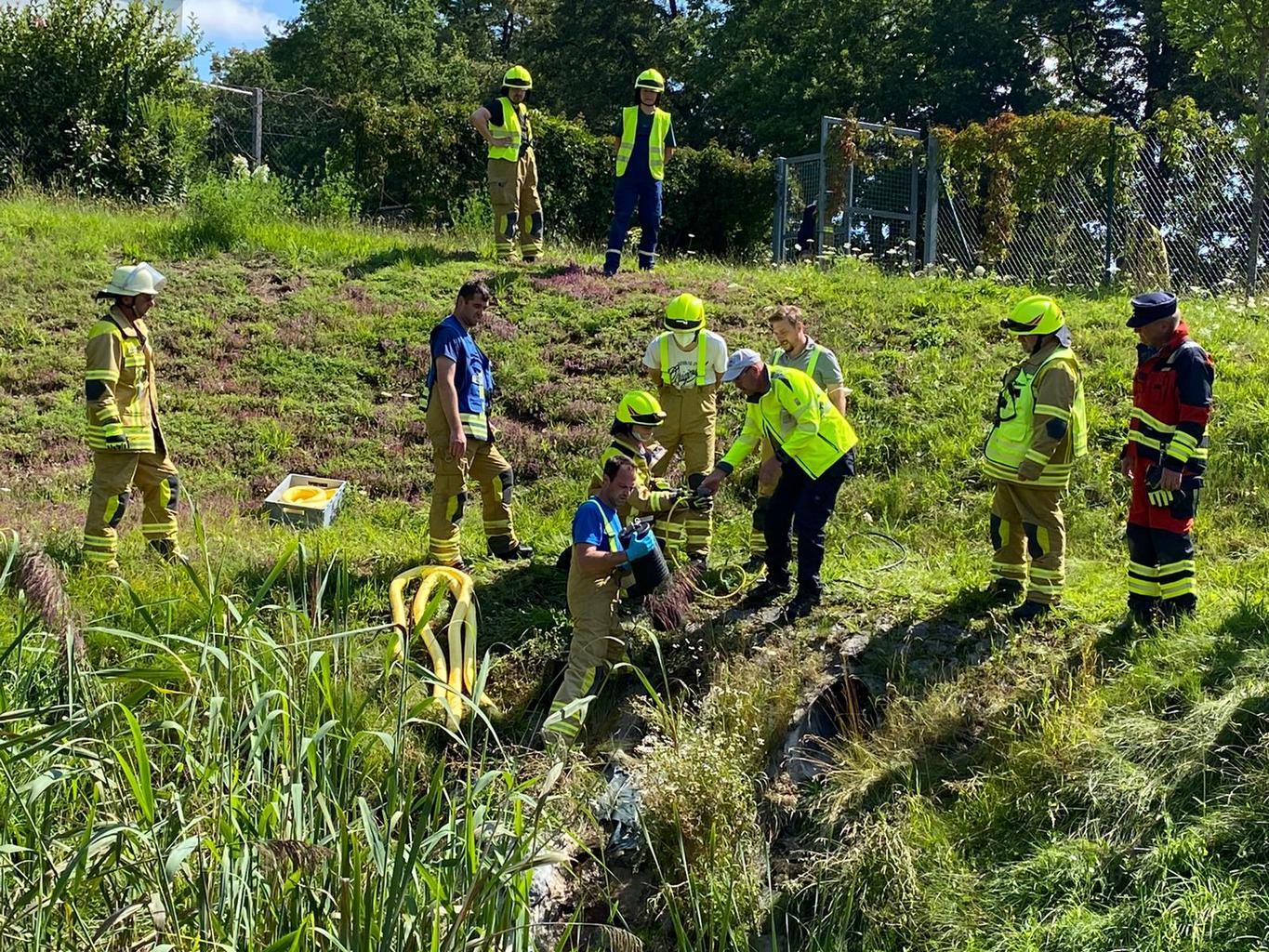 Zusammen mit den Kräften aus Hauzenstein fingen wir den restlichen Diesel auf und streuten die Straße ab. Durch das Einbringen eines Rohrdichtkissens konnte ein Eindringen des Gefahrstoffes in das Regenrückhaltebecken verhindert werden.