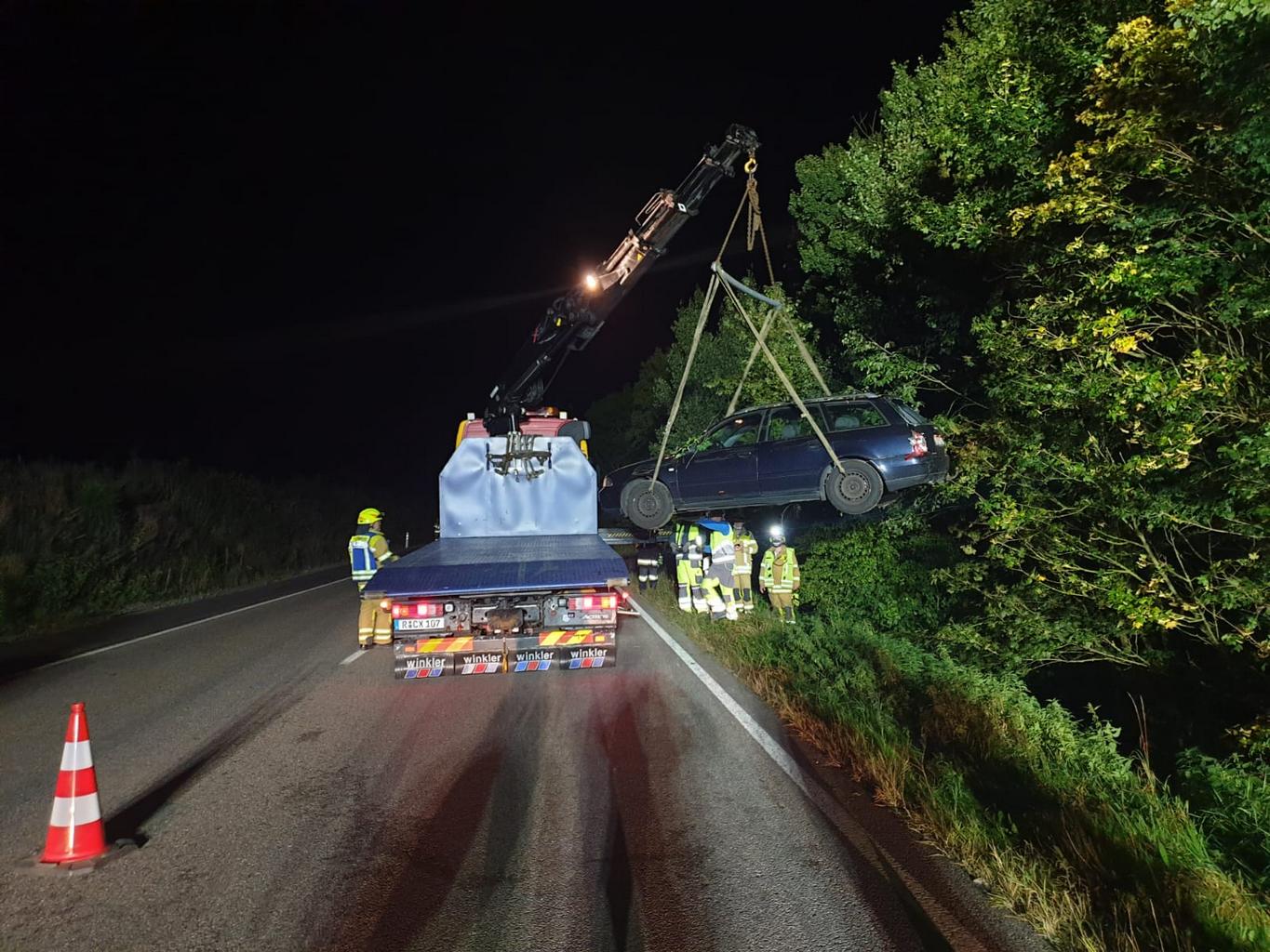 Zusammen mit den Kameraden aus Hauzenstein übernahmen wir die Verkehrsabsicherung. Der PKW wurde vom Abschleppdienst mittels Kran aus der Böschung gehoben und abtransportiert.