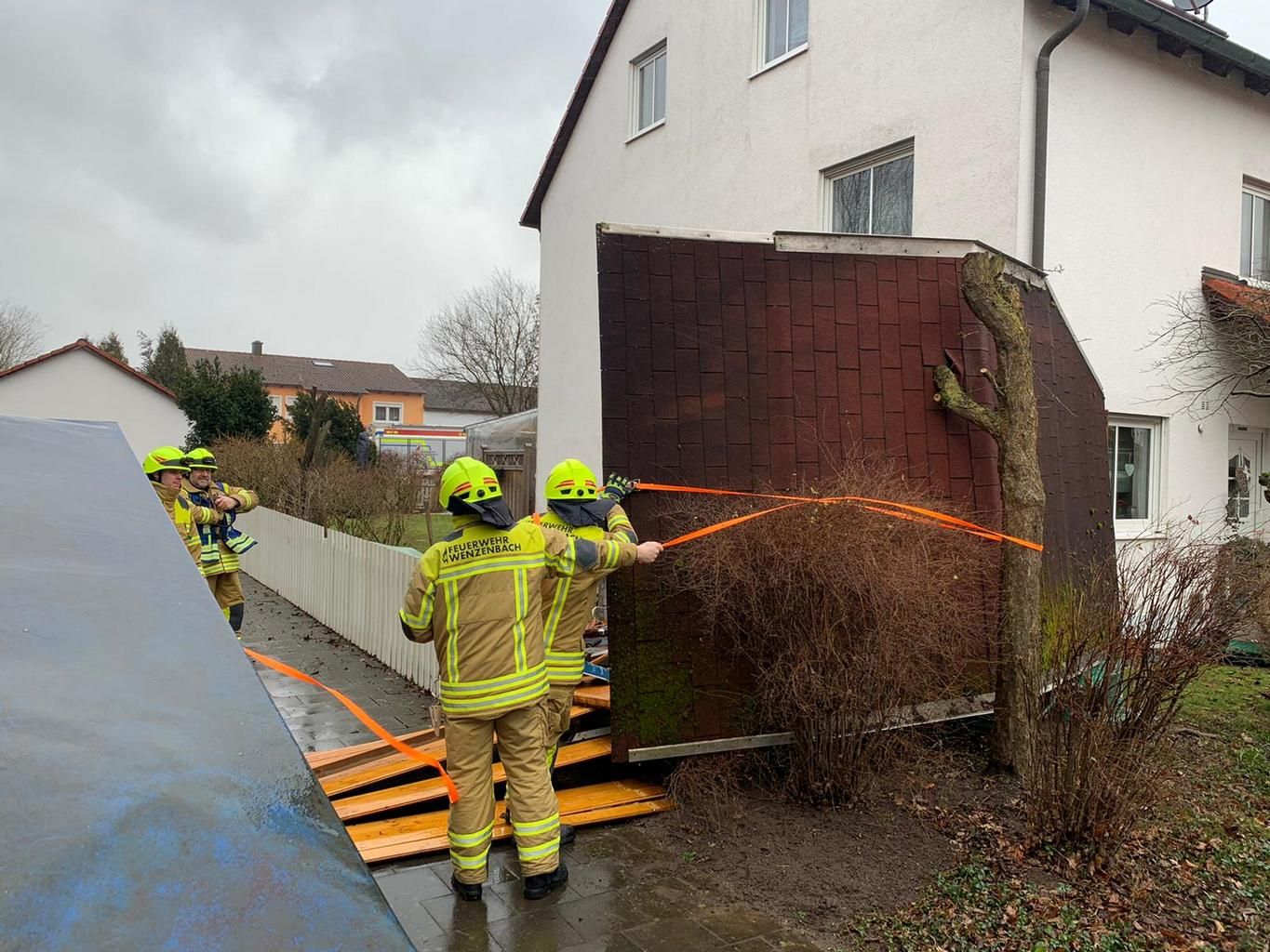 So galt es überwiegend umgefallene Bäume zu beseitigen. Zusätzlich waren zwei beschädigte Gartenhäuser zu sichern um eine Gefahr für den angrenzenden Straßenverkehr auszuschließen.