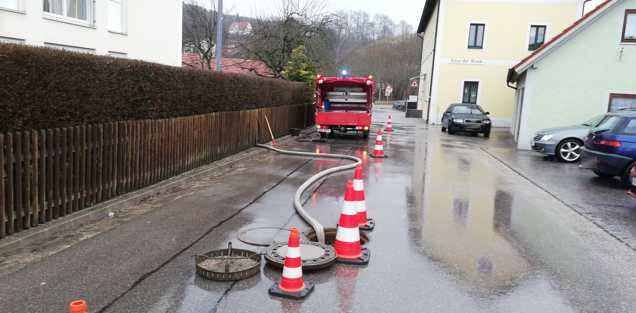 Das Wasser lief aus dem Siphon der Waschmaschinen zurück in Haus. Daraufhin wurde der Revisionsschacht geöffnet der komplett vollgelaufen war.