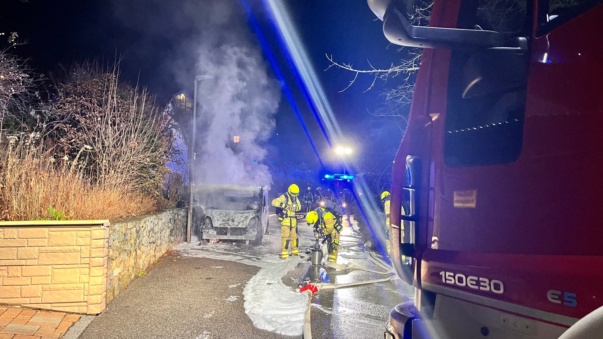 Wir wurden gemeinsam mit der Feuerwehr Hauzenstein in die Fichtelgebirgstraße in Wenzenbach zu einem PKW‑Brand alarmiert. Bereits auf Anfahrt bestätigte sich der Notruf: ein Kleintransporter stand in Vollbrand, wodurch auch eine Hecke und eine Straßenlaterne in Mitleidenschaft gezogen wurden. Unser Trupp unter PA begann sofort mit der Brandbekämpfung. Schnell war der Brand unter Kontrolle. Nach rund 2 Stunden waren die Lösch- und Aufräumarbeiten abgeschlossen.