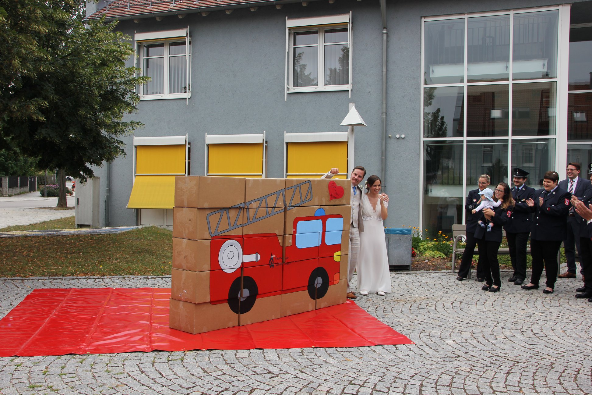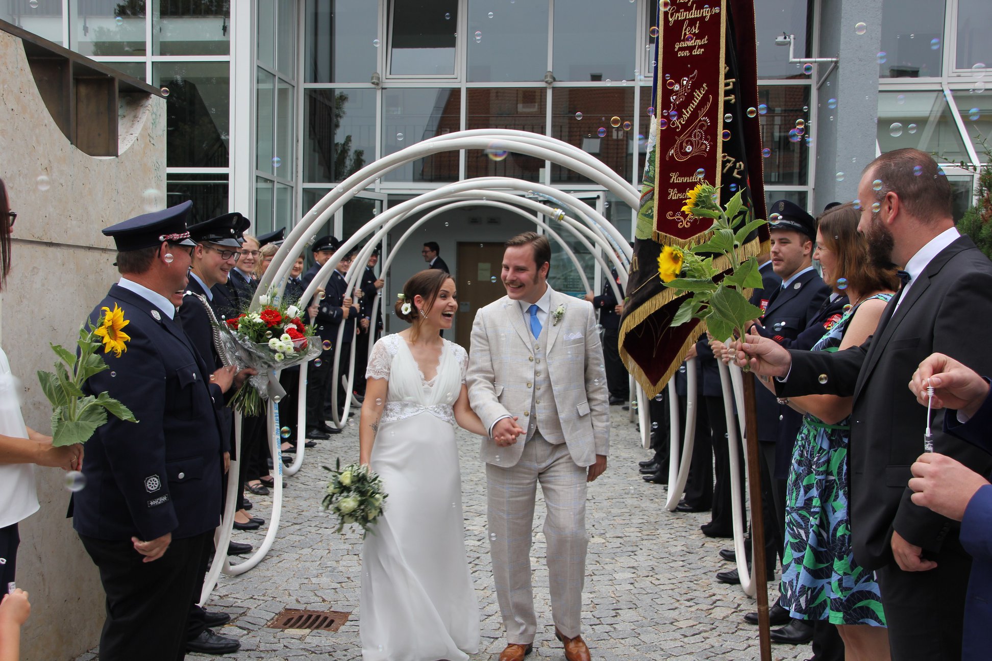 Am Rathaus stand eine Abordnung der Feuerwehr mit einem Schlauch-Spalier bereit.
