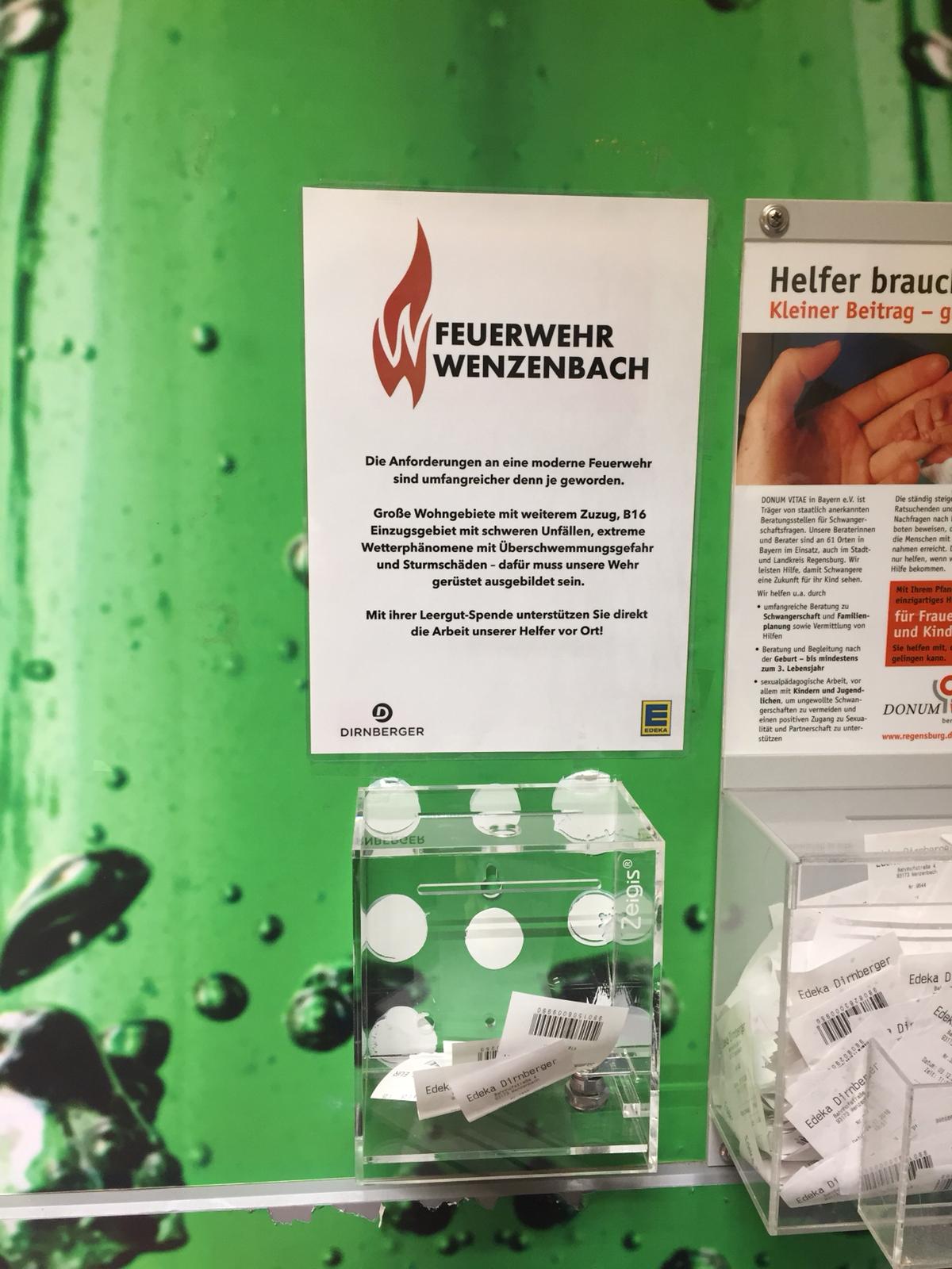 Sehr schöne Geste unseres EDEKA Dirnberger in der Bahnhofstraße in Wenzenbach. Mit den Pfandbons helfen Sie unserer Jugendfeuerwehr bei Beschaffungen und uns bei der Finanzierung spezieller Ausbildungen und Schulungen.