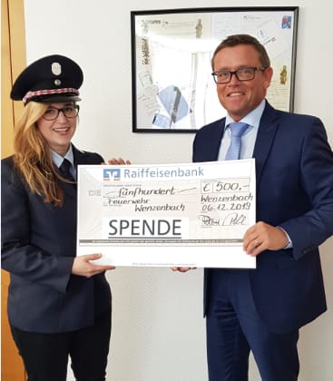 Am Montag, dem 09. Dezember 2019 überreichte Norbert Riederer, der Leiter der Raiffeisenbank-Geschäftsstelle in Wenzenbach, eine Spende über 500 Euro an Bettina Pfeilschifter, die erste Vorsitzende der FF Wenzenbach.