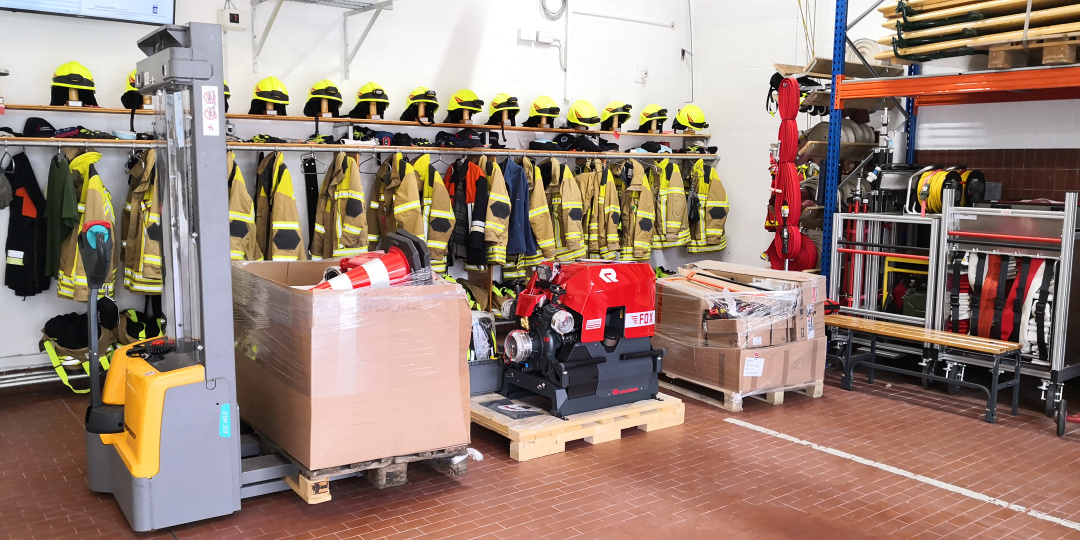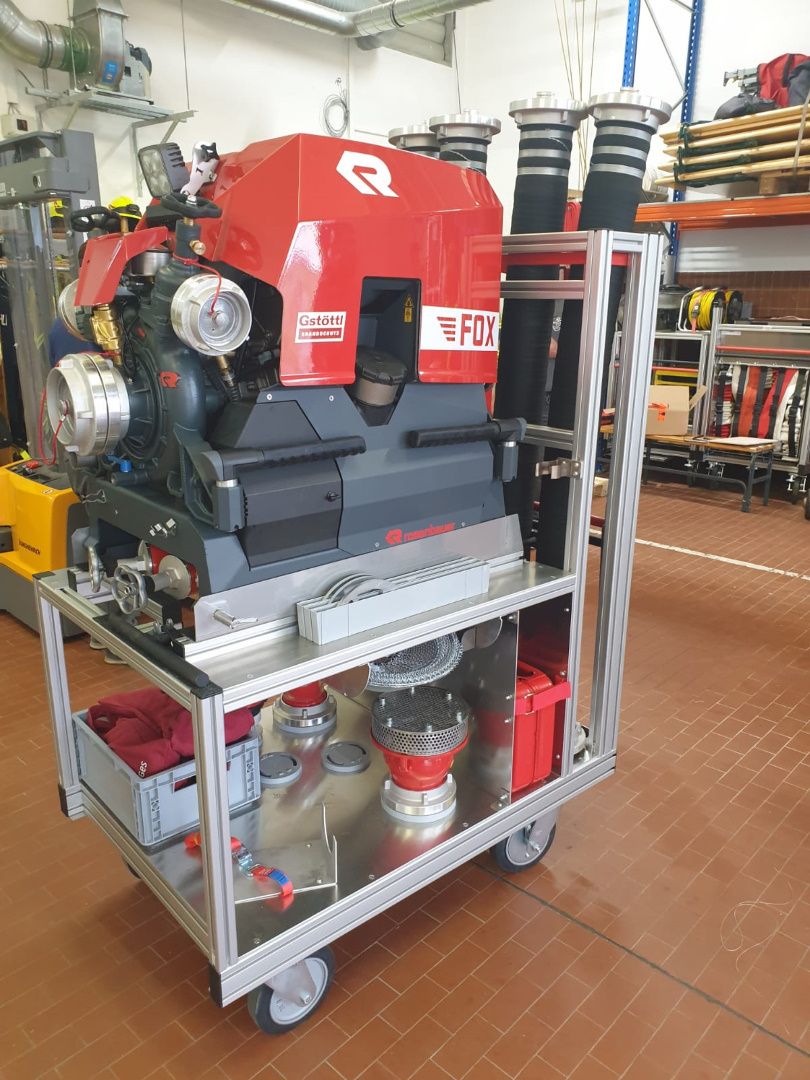 Mit dabei die neue tragbare Pumpe - eine Rosenbauer FOX 4, komplett mit Zubehör wie den Saugschläuchen und Armaturen.
