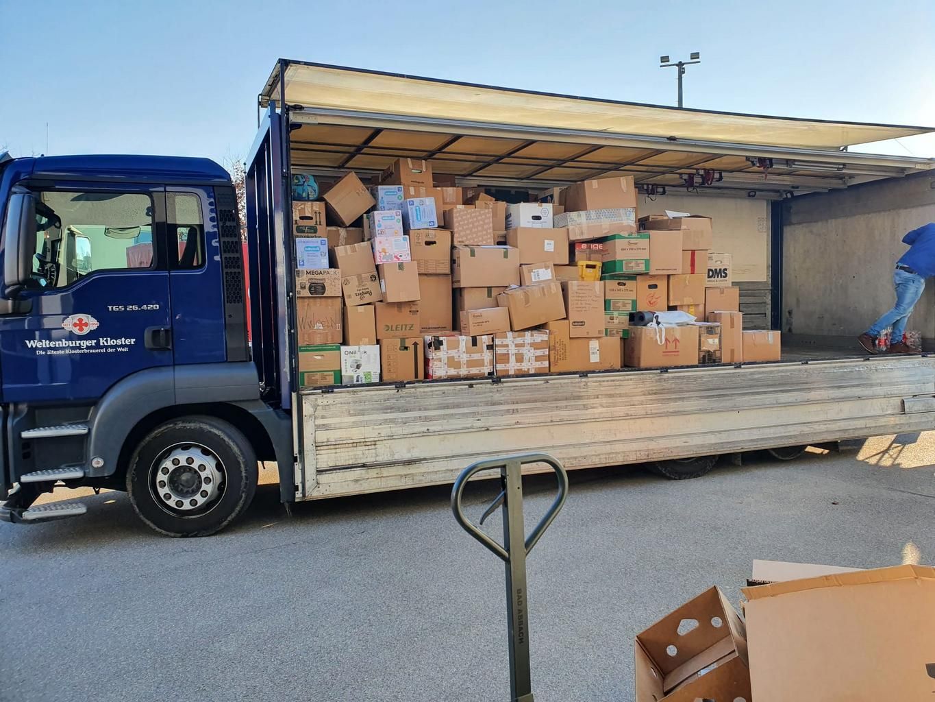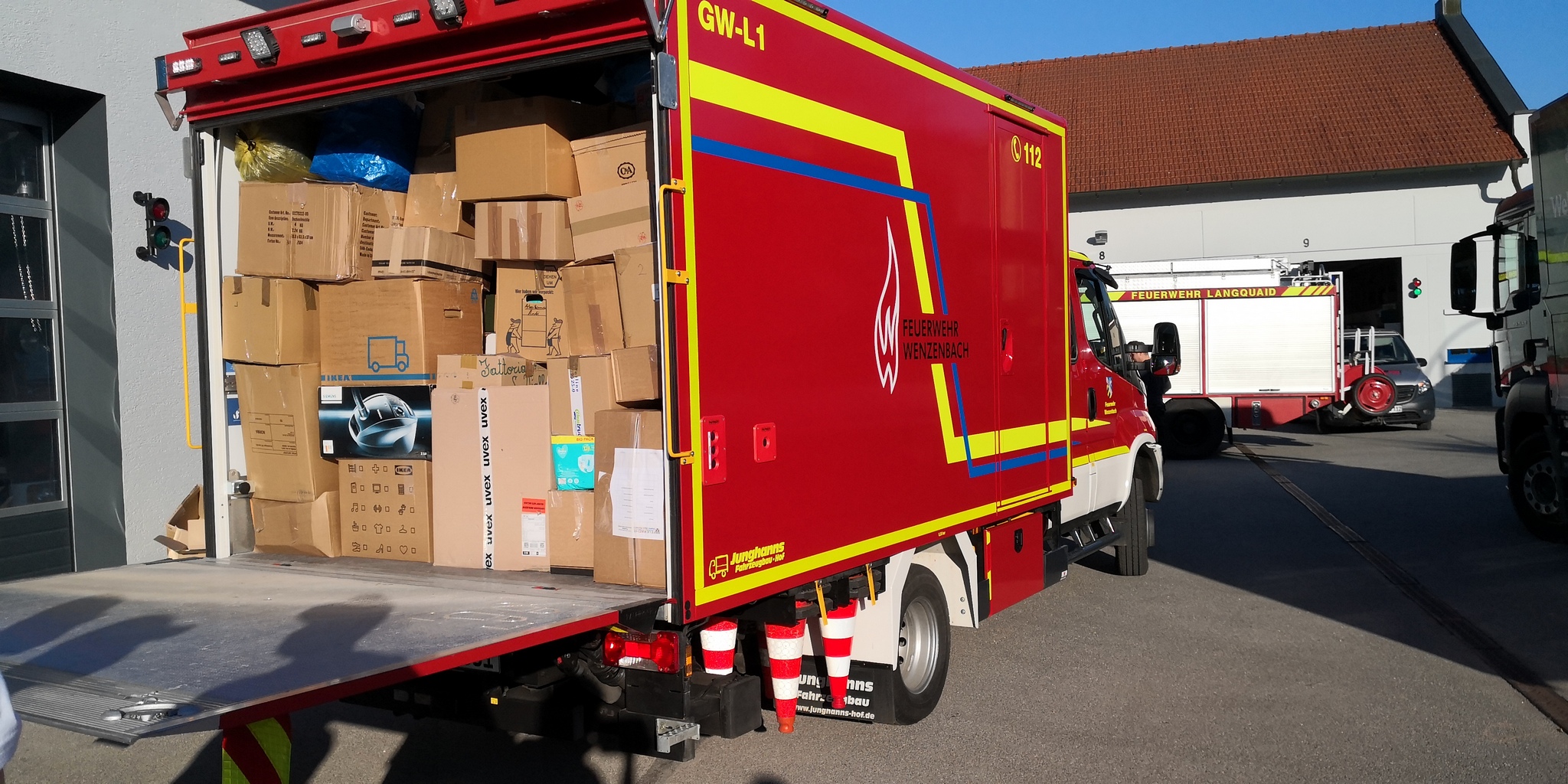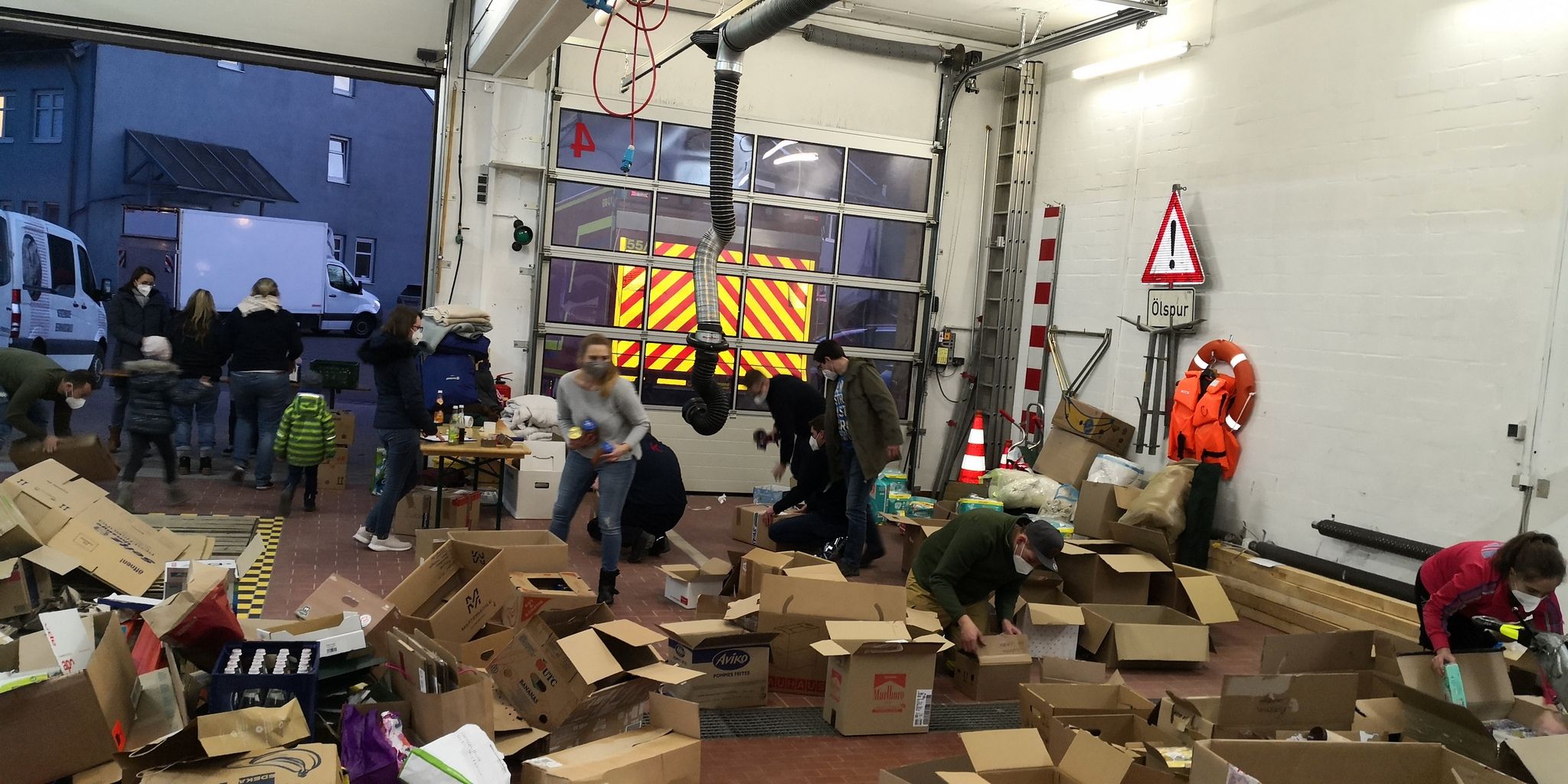 Unser Gerätehaus diente als zentraler Sammelplatz auch für die Sammelaktion aus Bernhardswald (120 Kartons) sowie der Feuerwehr Wutzlhofen. Die ebenfalls an der Aktion beteiligte Feuerwehr Bad Abbach platzte aus allen Nähten, sodass wir kurzfristig unsere Transportkapazitäten teilten und etwa 750 Kartons mit dem Gerätewagen und dem 26 Tonner der Brauerei Bischofshof abholten.