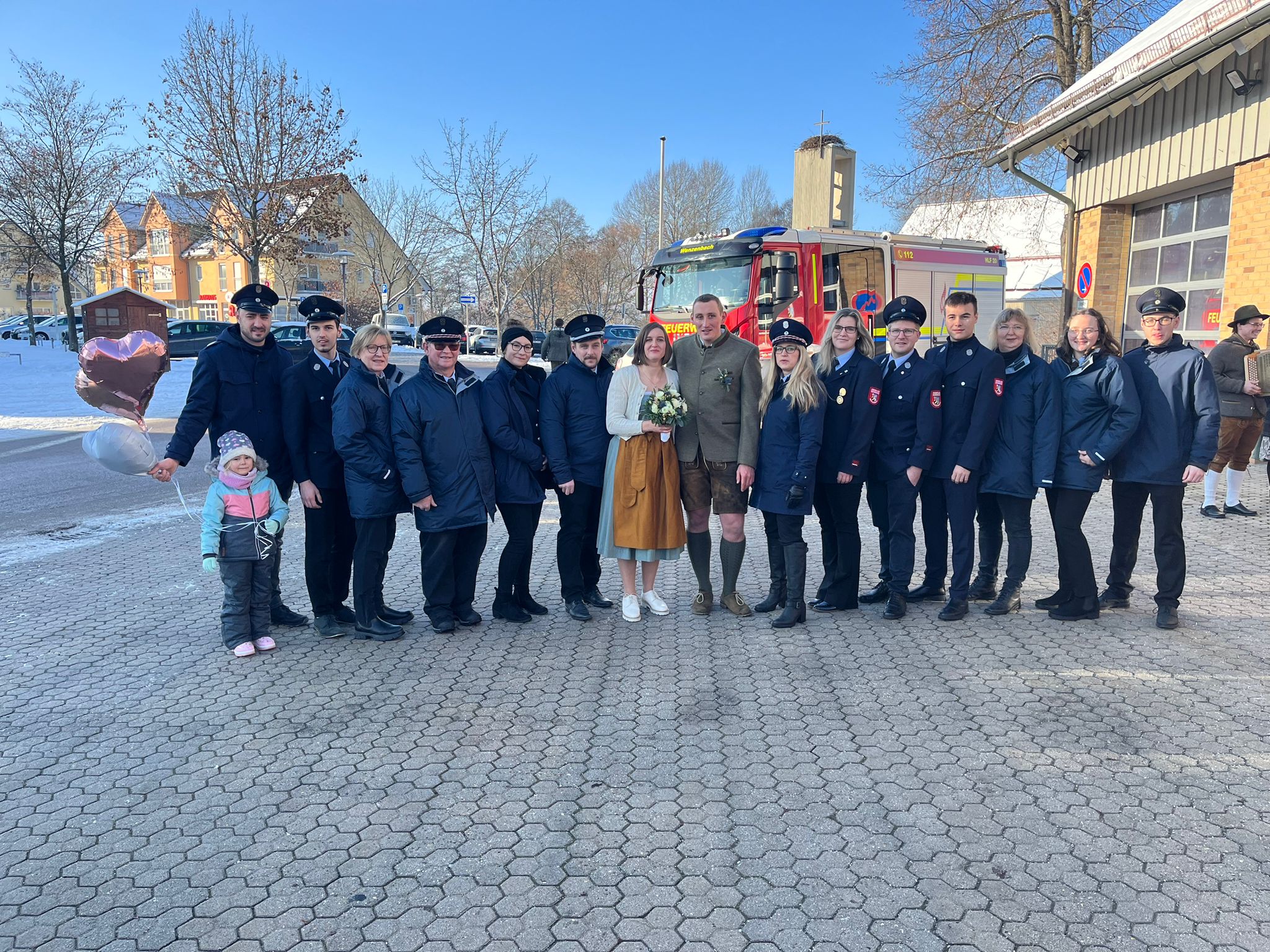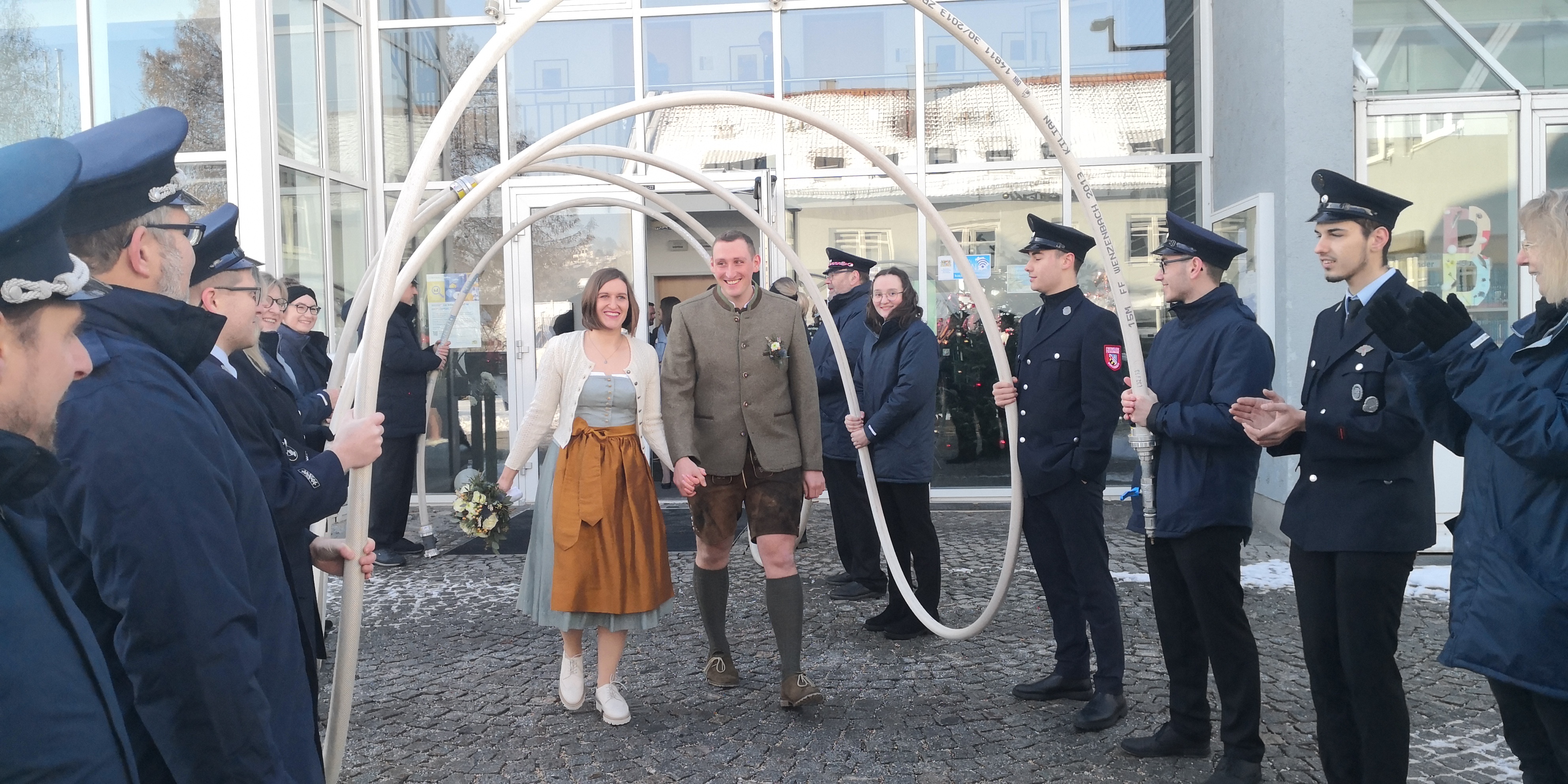 Bei schönem, aber eisigen Wetter verharrten die Mitglieder der Feuerwehr sowie der vielen örtlichen Vereine in der Christian aktiv ist vor dem Rathaus, um das Paar gebührend zu empfangen.