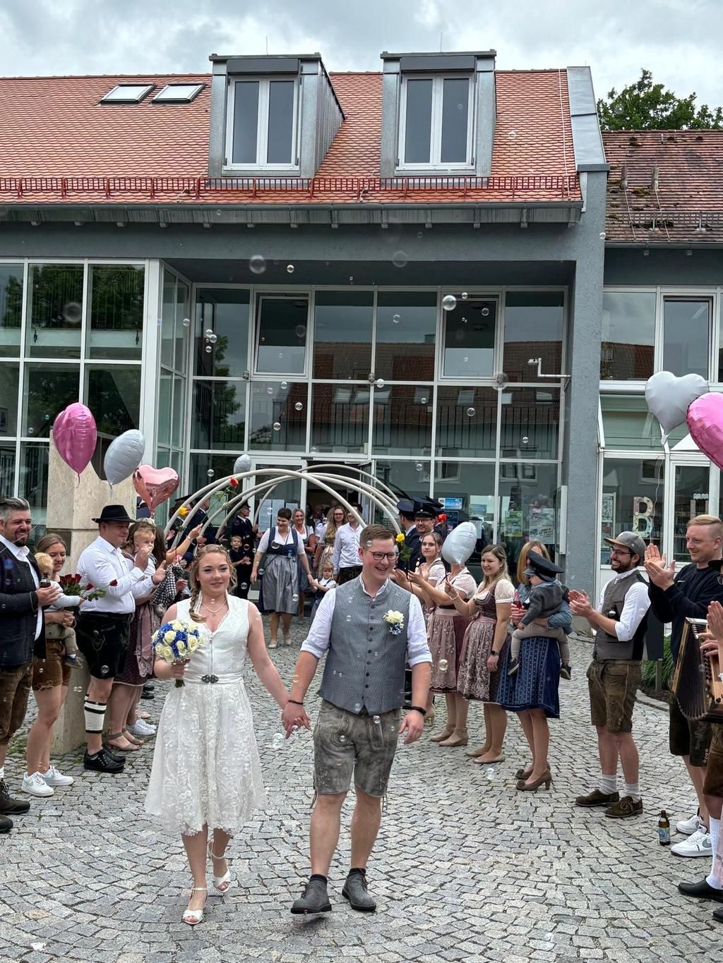 Bei nicht ganz perfektem Wetter, dafür umso besserer Stimmung verlegten wir den Sektempfang kurzerhand in das Feuerwehrgerätehaus, welches bereits für das Floriansfest vorbereitet war. Natürlich wurde anschließend das Paar angemessen mit dem gesamten Fuhrpark bis zum Ortsrand unter Blaulicht und Martinhorn begleitet.