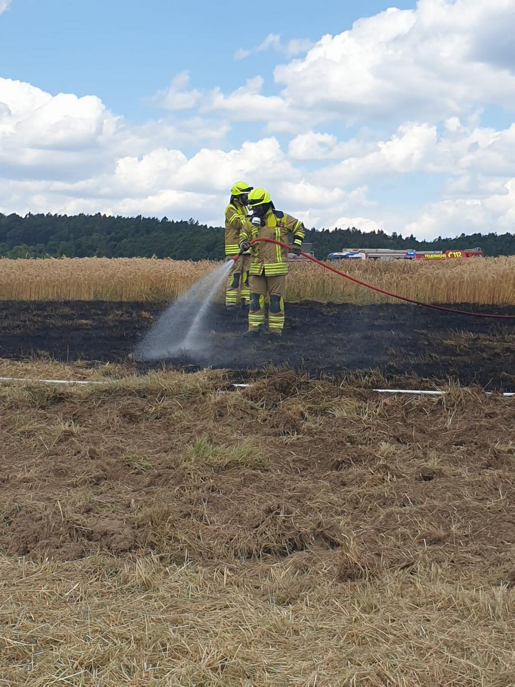 Durch den beherzten Einsatz der anwesenden Landwirte wurde bereits mit einem Grubber eine Schneise hergestellt, welche die weitere Ausbreitung verhinderte. Mit Wasser aus einem Gülleanhänger konnte ein Großteil des Feuers eingedämmt werden. Die Nachlöscharbeiten übernahmen wir mit den Grünthaler Kameraden.