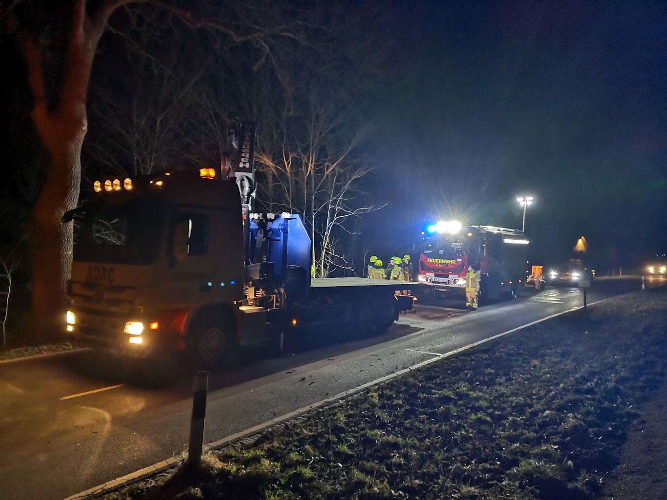 Nachdem der PKW vom Abschleppdienst mittels Kran aus der Böschung gehoben und abtransportiert wurde, reinigten wir die Straße und hoben anschließend die Vollsperrung wieder auf.
