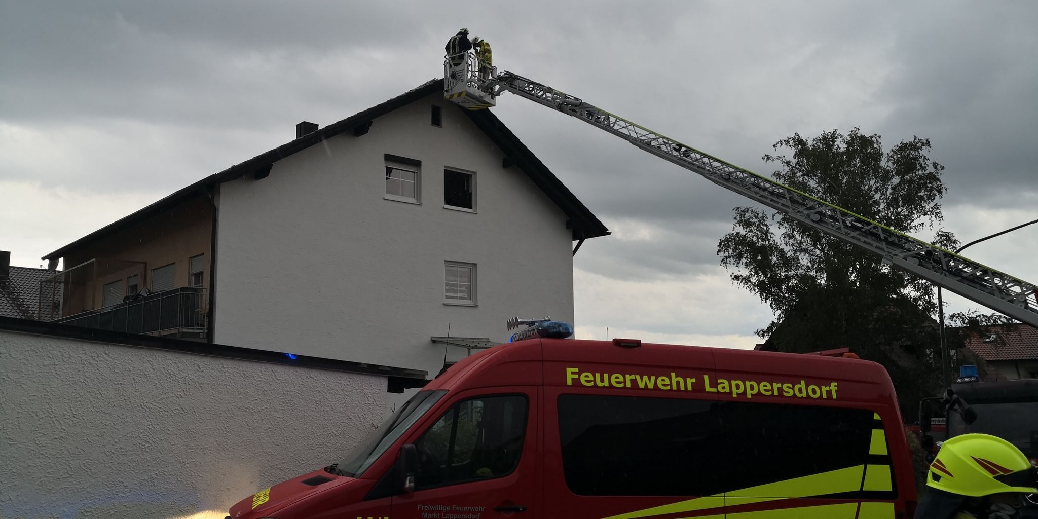 Die örtlich zuständige Feuerwehr Grünthal kontrollierte mit Hilfe der Wärmebildkamera das Dach von der Lappersdorfer Drehleiter aus und konnte bald Entwarnung geben. Anschließend wurden die losen Dachziegel gesichert, sowie die Dachhaut notdürftig verschlossen.