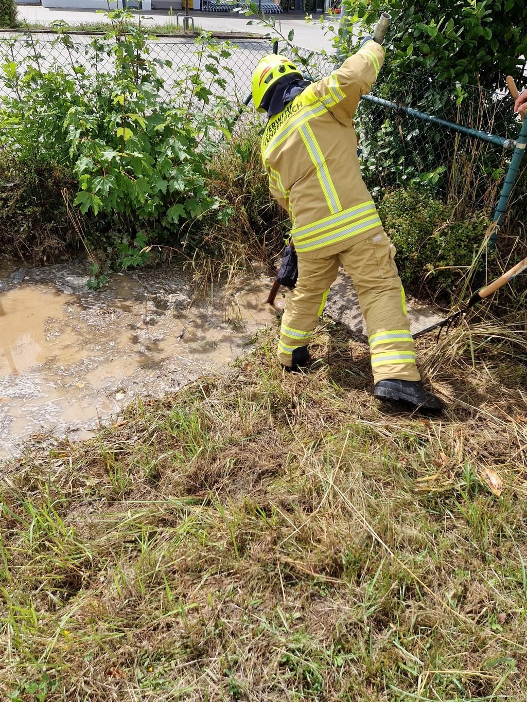 Der Durchlauf unter der Parkplatzeinfahrt zum Penny war ebenfalls verstopft und musste abgepumpt und gereinigt werden. Der Graben ist übergelaufen und hat die Regensburgerstraße im Kreuzungsbereich überflutet.