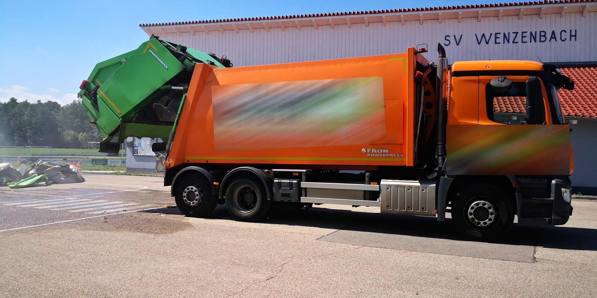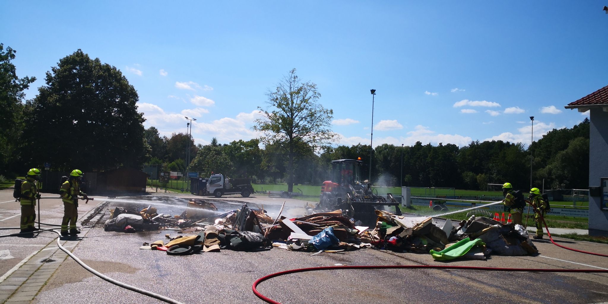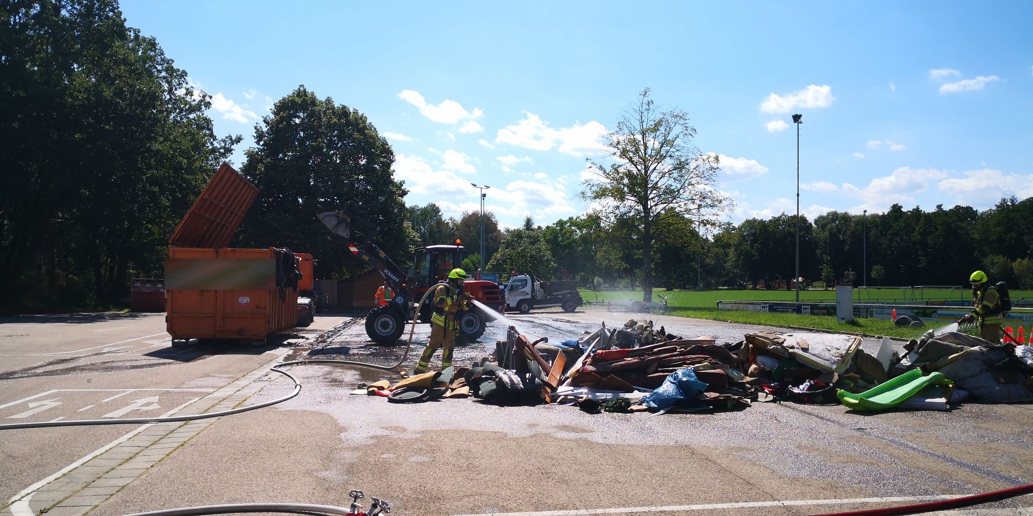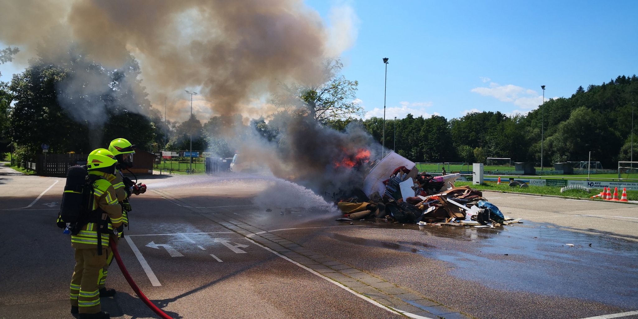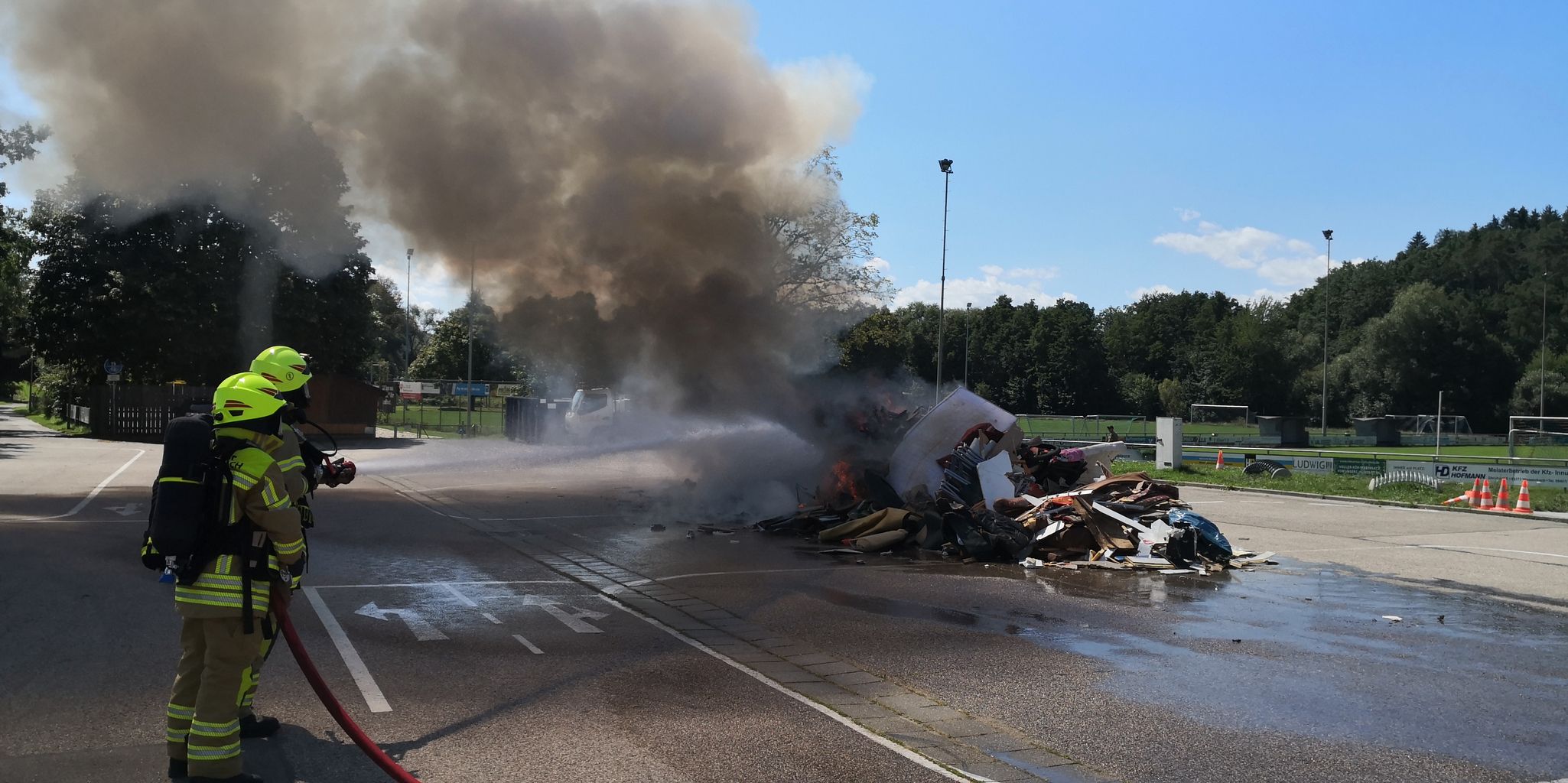 Wir wurden mit der Meldung "Sperrmüll brennt auf LKW" in den Jahnweg in Wenzenbach gerufen. Ein LKW eines Entsorgungsunternehmens war auf einer Tour unterwegs um Sperrmüll aufzunehmen. Während der Fahrt geriet seine Ladung in Brand. Der Fahrer reagierte dabei äußerst besonnen, steuerte umgehend den nächsten Parkplatz an und entlud den brennenden Müll. Im Bereich der offenstehenden Heckklappe bildete sich trotzdem bereits ein Entstehungsbrand.