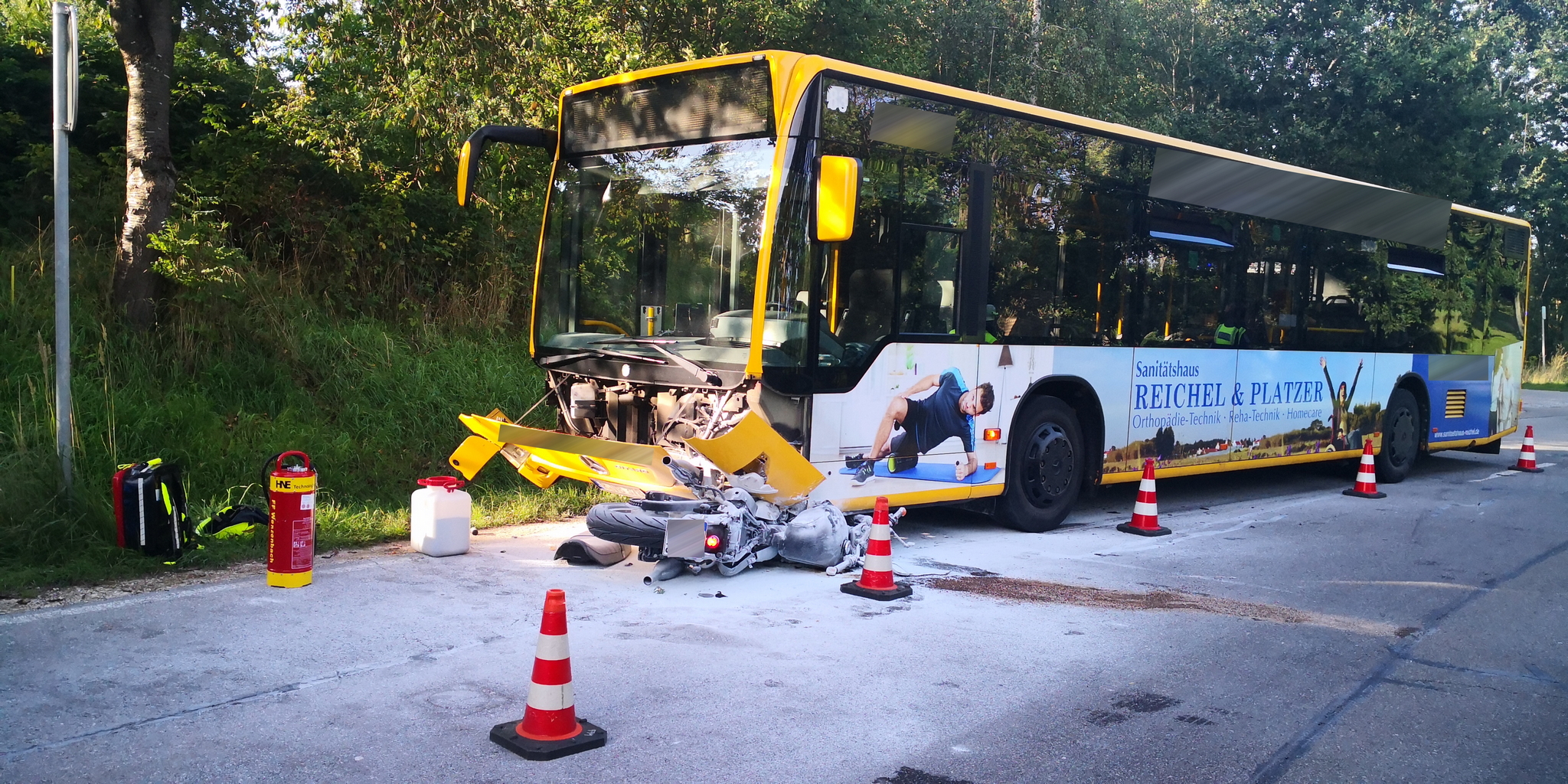 Ein Motorradfahrer war auf der Chamerstraße in Richtung Bernhardswald unterwegs und in einer Rechtskurve alleinbeteiligt gestürzt. Der Mann zog sich dabei leichte Verletzungen zu. Das Motorrad schlitterte auf der Fahrbahn im Gegenverkehr in einen entgegenkommenden Linienbus. Der Busfahrer und die wenigen Fahrgäste blieben dabei unverletzt.