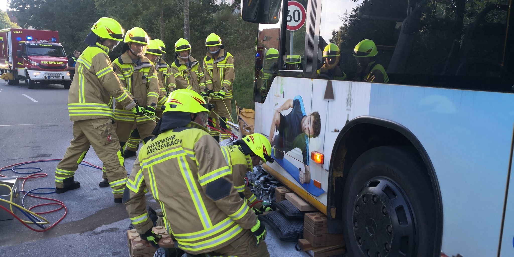 Zur Vorbereitung wurde mittels Luftheber der Bus ein wenig angehoben, um das eingekeilte Motorrad herausziehen zu können. Anschließend reinigten wir die Fahrbahn und konnten dann die Heimreise antreten.