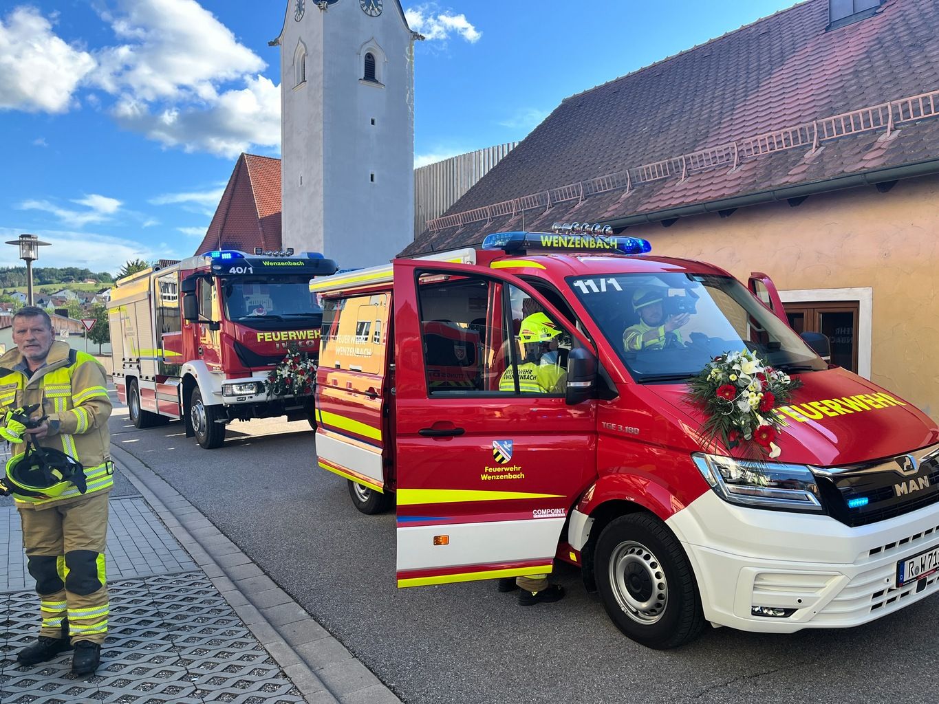 Ein seltenes Bild boten unsere beiden am Einsatz beteiligten Fahrzeuge - das MZF und HLF - diese waren mit Blumenschmuck bestückt, da diese noch 20 Minuten zuvor am Floriani ihren kirchlichen Segen erhielten.