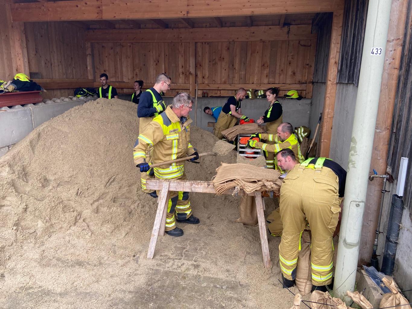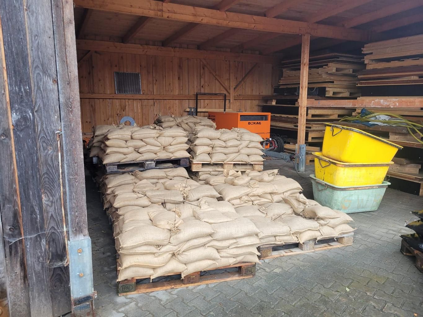 So wurden erste Vorbereitungen getroffen, bevor dann gegen 10:30 der erste Alarm für die Mannschaft ausgelöst wurde. Dank der großen Unterstützung des Wenzenbacher Bauhofs konnten wir zügig damit beginnen unsere rund 1200 Sandsäcke zu füllen und auf Paletten zu verlasten. Der Lader und die LKWs des Bauhofs waren dabei eine unverzichtbare Hilfe.