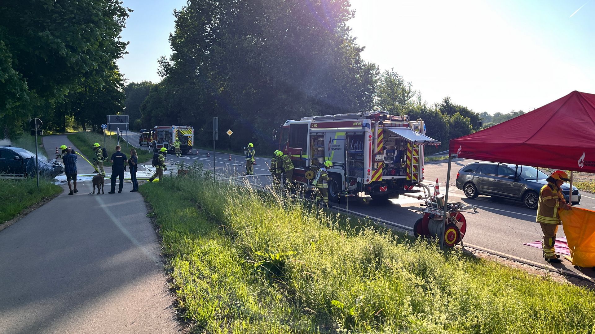 Wir wurden zu einem Pkw-Brand auf Höhe der Ausfahrt der B16 gerufen. Der Fahrer bemerkte eine Rauchentwicklung im Motorbereich seines Fahrzeugs und brachte es abseits der Straße sicher zum Stehen. Zeugen des Vorfalls alarmierten die Leitstelle und unternahmen noch einen Löschversuch mit einem Feuerlöscher.