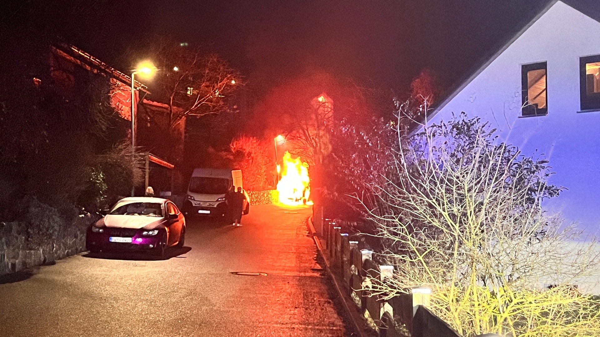 Wir wurden gemeinsam mit der Feuerwehr Hauzenstein in die Fichtelgebirgstraße in Wenzenbach zu einem PKW‑Brand alarmiert. Bereits auf Anfahrt bestätigte sich der Notruf: ein Kleintransporter stand in Vollbrand, wodurch auch eine Hecke und eine Straßenlaterne in Mitleidenschaft gezogen wurden. Unser Trupp unter PA begann sofort mit der Brandbekämpfung. Schnell war der Brand unter Kontrolle. Nach rund 2 Stunden waren die Lösch- und Aufräumarbeiten abgeschlossen.