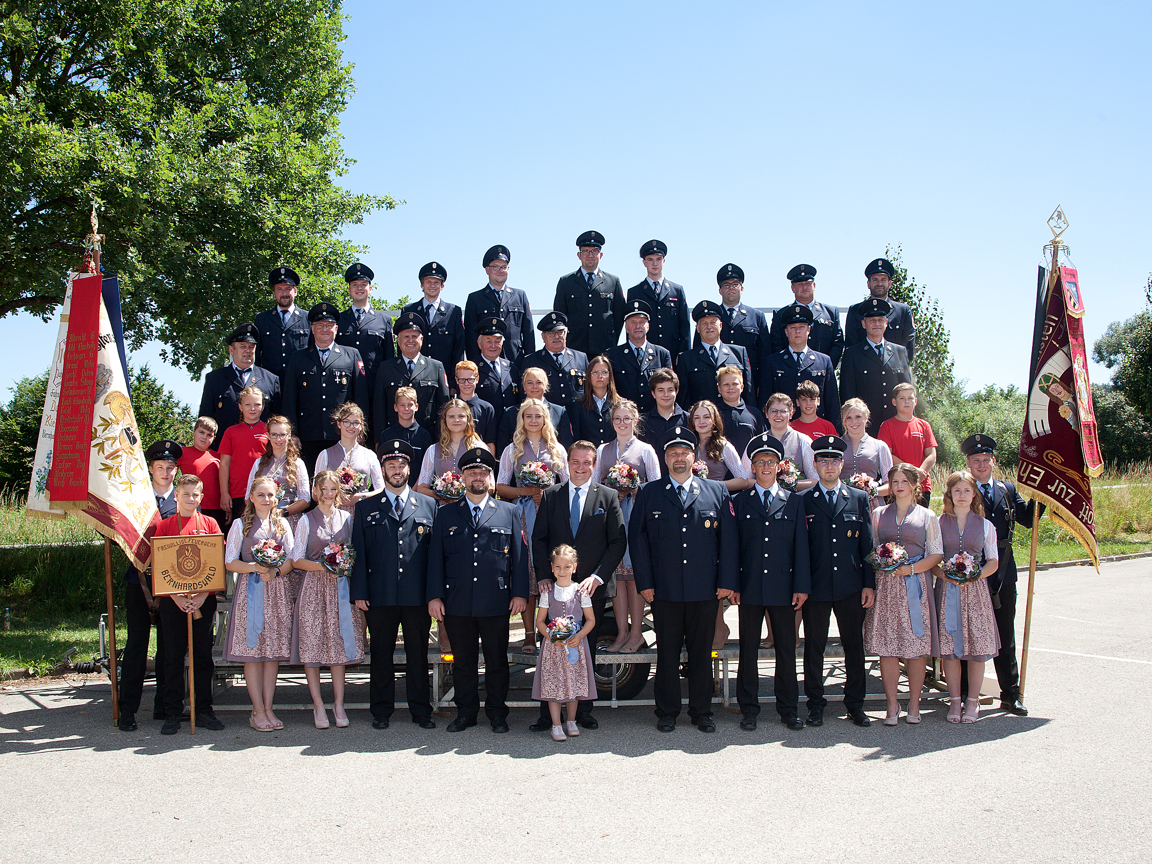 Nachdem die Gruppenaufnahmen beider Vereine „im Kasten“ waren, ging es mit unserem Schirmherrn Sebastian Koch weiter zum Gründungsort unserer Wehr, dem Schloss Schönberg, wo im Schlosshof ein sehr feierlicher Gedenkgottesdienst stattfand. Bevor es dann zu unserer Partylocation, der Grundschulturnhalle ging, machten wir noch einen Zwischenstopp am Gerätehaus, um das „Zeichen des Erinnerns“ zu enthüllen und die Patengeschenke auszutauschen. Wir hatten uns im Vorfeld mit der FF Bernhardswald darauf geeinigt, uns Holzbänke zu schenken.